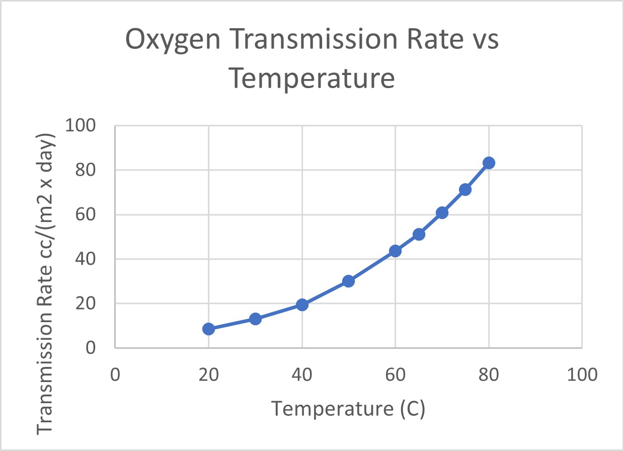 Quando pensiamo alla permeazione e al modo in cui i gas si diffondono attraverso i campioni polimerici, è importante capire che temperature più elevate aumentano la quantità di "energia" all'interno del sistema e le molecole permeanti si muovono (o si diffondono) più velocemente. Per dirla in modo più semplice, le velocità di trasmissione aumentano con l'aumentare della temperatura.