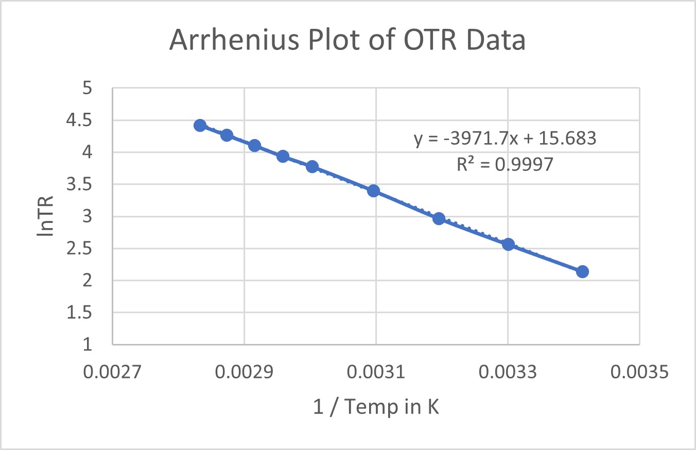 Rappresentando graficamente questa relazione, possiamo stimare la velocità di trasmissione ad altre temperature. Tuttavia, la natura curva di questa relazione rende difficile prevedere con precisione le velocità di trasmissione. Come spesso osservato con altre reazioni in natura, questi dati sulla temperatura e sulla velocità di trasmissione seguono una relazione di Arrhenius. Rappresentare graficamente i dati con un grafico di Arrhenius (lnTR vs 1/Temp K) può essere un potente strumento predittivo se i dati mostrano una linea retta. Quando ciò si verifica, utilizzando l'equazione lineare della retta, è possibile calcolare l'OTR per altre temperature.