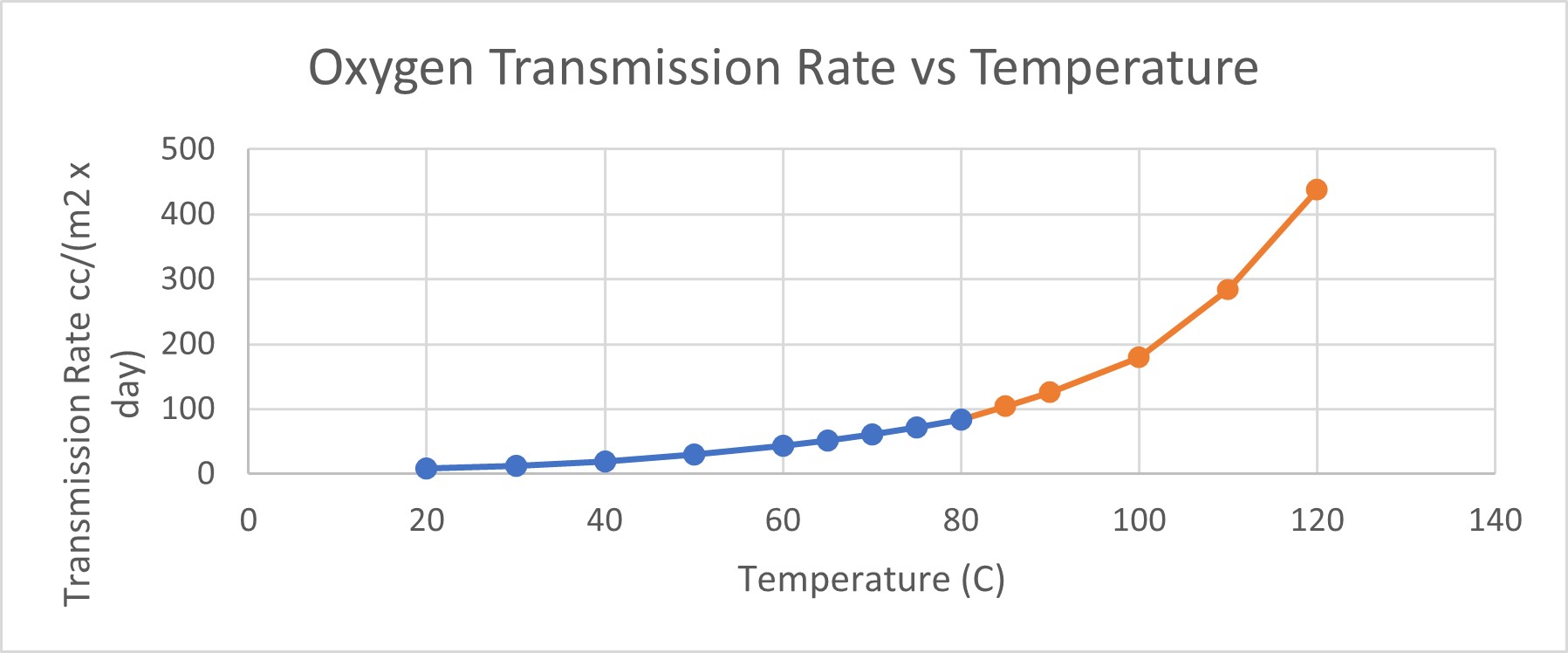 temperatura di transizione vetrosa del materiale, che modifica la velocità di diffusione del gas permeante e la sua relazione Arrhenius. Ad esempio, il grafico seguente include ulteriori risultati OTR a temperature più elevate per lo stesso materiale, fino a 120 °C.