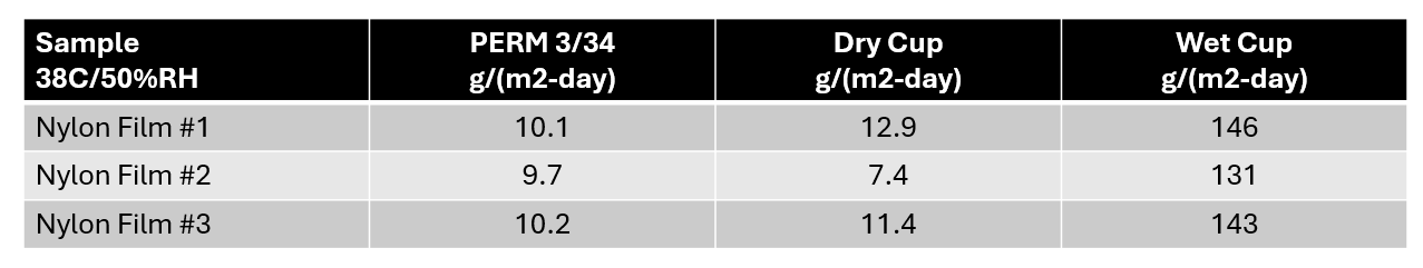 Il nylon è un materiale noto per la sua sensibilità all'umidità. Quando si confrontano la velocità di trasmissione dell'ossigeno (OTR) e la velocità di trasmissione del vapore acqueo (WVTR) per i film in nylon, è importante prestare molta attenzione al metodo di prova utilizzato. Ad esempio, i risultati WVTR per un tipico film in nylon possono variare significativamente a seconda che il test segua gli standard ASTM E96 o ASTM F1249. Anche quando entrambi i test utilizzano lo stesso gradiente di forza motrice (ad esempio, 50% di umidità relativa), il livello di trasmissione può variare a seconda che venga utilizzato un metodo a tazza asciutta o bagnata (vedere Tabella 1).