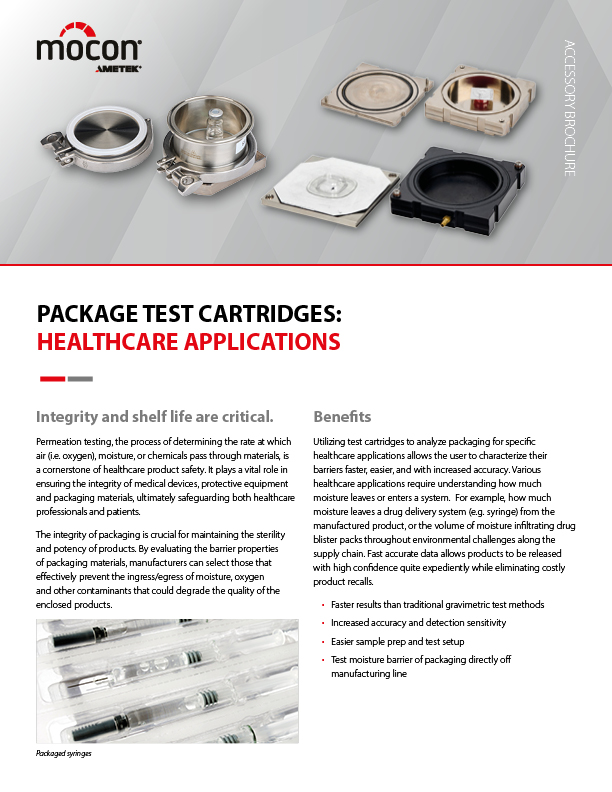 Diversi anni fa, il team di AMETEK MOCON ha deciso che doveva esistere un metodo migliore per testare accuratamente i pacchetti, riducendo al minimo la manodopera e la confusione. Di conseguenza, abbiamo inventato una serie di cartucce di prova per una varietà di tipi di pacchetti comuni, che hanno consentito un montaggio semplificato e risultati di prova migliori. I clienti che utilizzano queste cartucce segnalano un aumento del numero di test, una riduzione della manodopera e risultati più ripetibili.