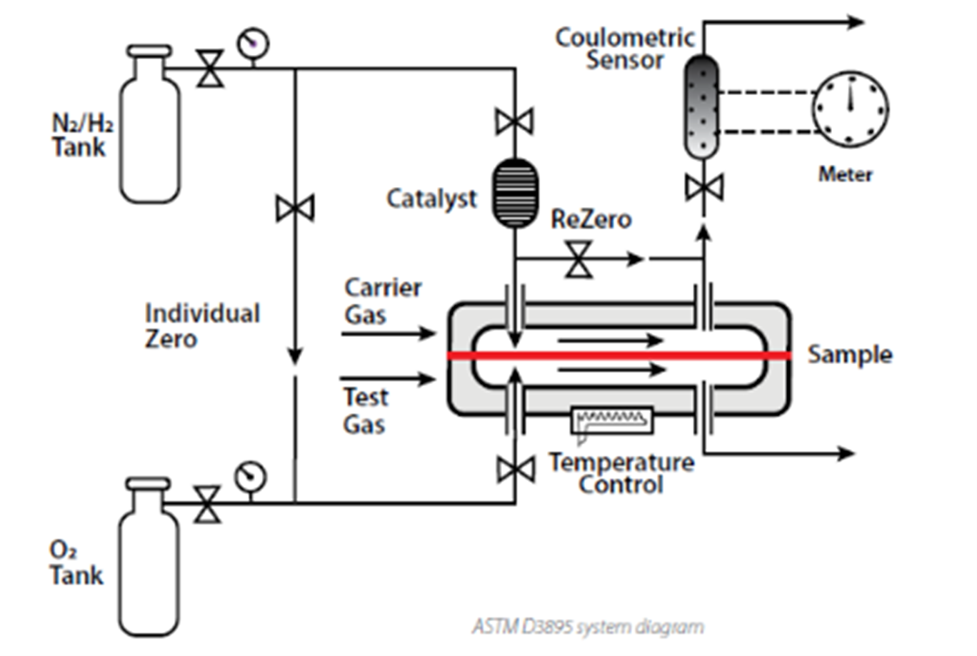 ASTM D3985/F1927 Questo è il classico metodo del "sensore coulometrico", che rappresenta lo standard di riferimento del settore dal 1981. Un lato della pellicola (o della confezione, nel caso dello standard ASTM F1927) viene esposto all'ossigeno secco, mentre il lato opposto viene attraversato da azoto secco (lo standard ASTM F1927 prevede l'utilizzo di gas con un determinato livello di umidità). L'ossigeno che attraversa la pellicola viene convogliato in un sensore coulometrico (elettrochimico), che ne quantifica la quantità.