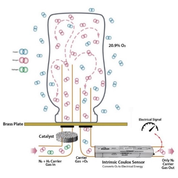 - Qualsiasi ossigeno in trasmissione attraverso il campione viene spinto dall'azoto gassoso a un rilevatore coulometrico, dove viene misurato l'ossigeno in trasmissione.