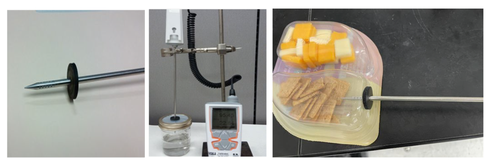 - Attacca un setto alla confezione campione. Utilizziamo il setto nero Dansensor® Lippke® 5000, che aderisce alla superficie della confezione, si adatta perfettamente al diametro della sonda e impedisce la migrazione dell'umidità dell'aria ambiente la lettura.Con una punta affilata personalizzata apposta sulla sonda, perforare la confezione, lasciando la punta della sonda di circa 1” nell'area dello spazio di testa.